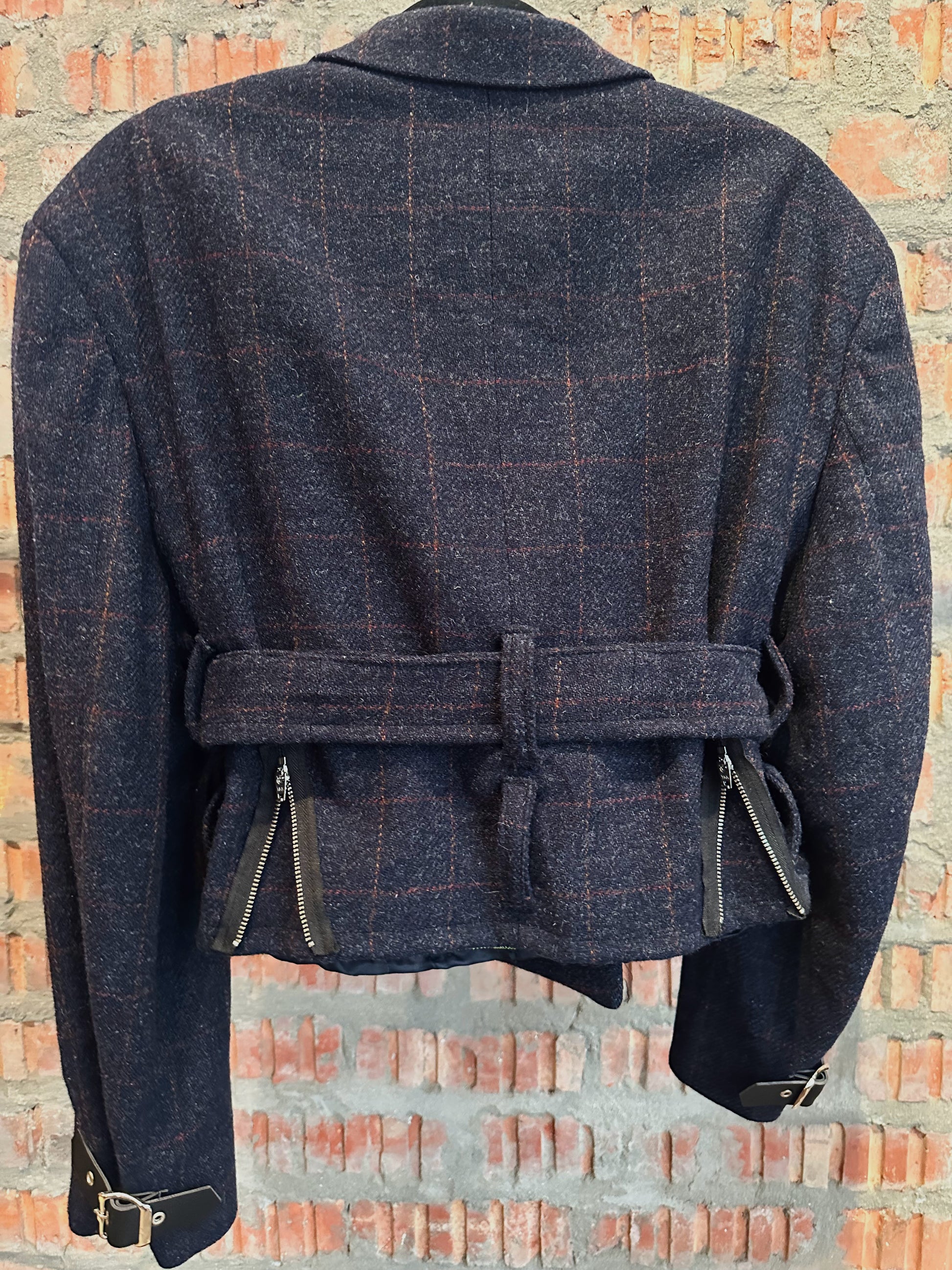 This unisex upcycled one-of-a-kind piece was originally crafted from a plaid men’s blazer. It features two rows of belt loops, allowing you to style the jacket in different ways — either cinched at the waist for a more feminine, tailored silhouette, or worn lower for a relaxed, biker-inspired look.
