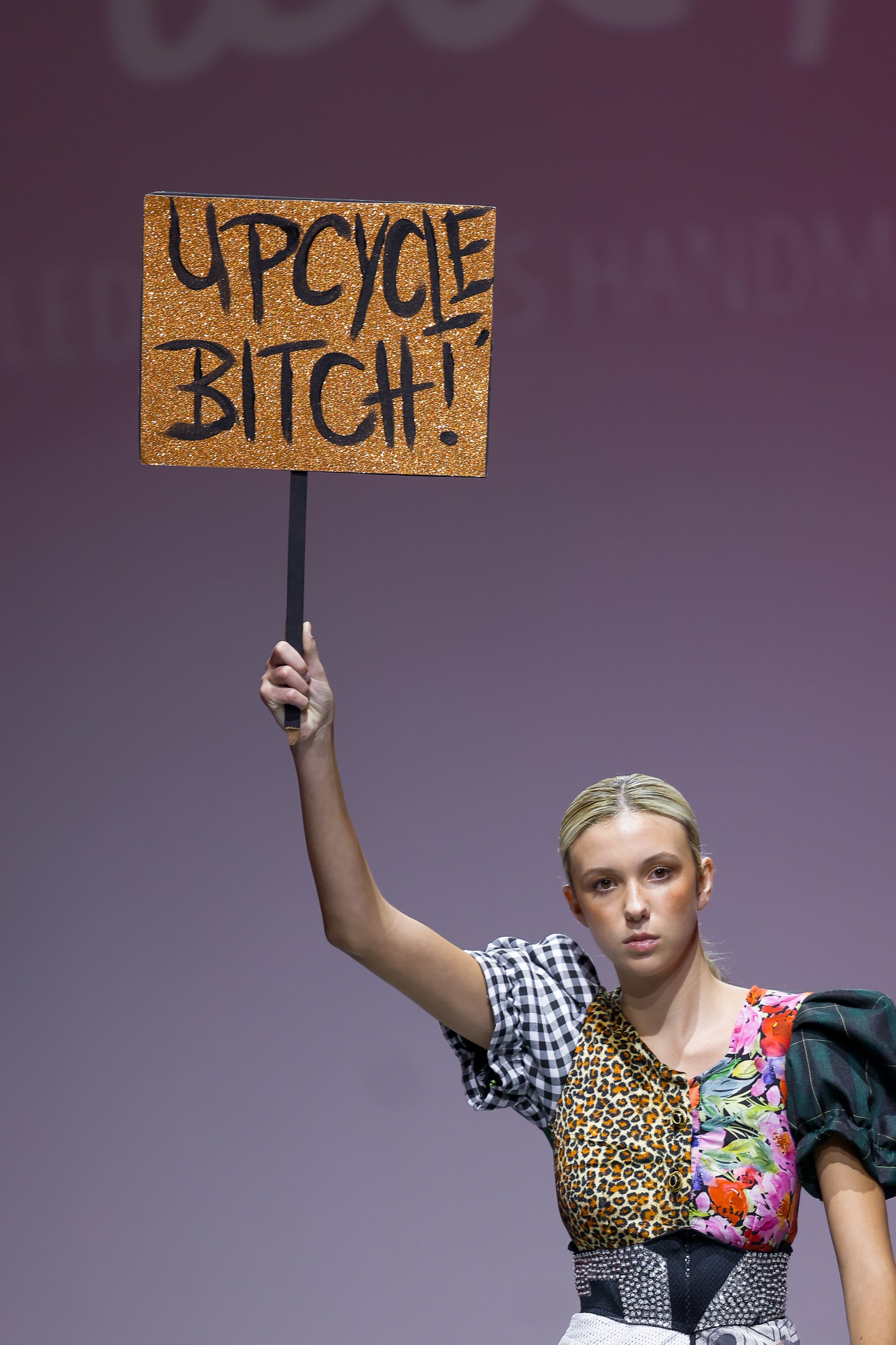 Arrangement of fabric scraps chosen and laid out carefully and upcycled by hand. Unique piece. Size S/M.