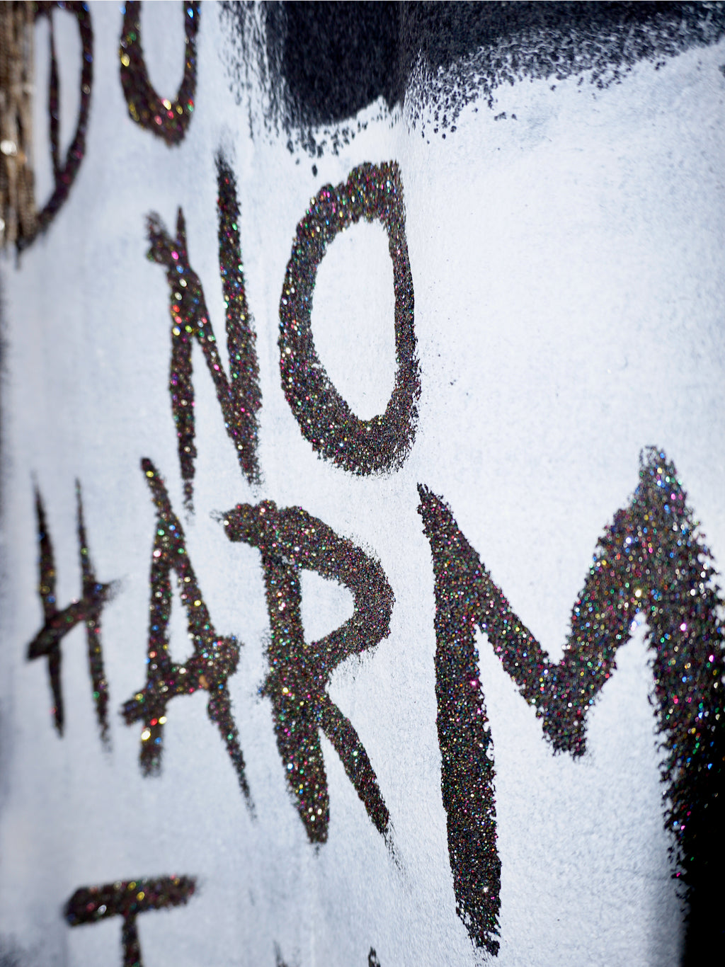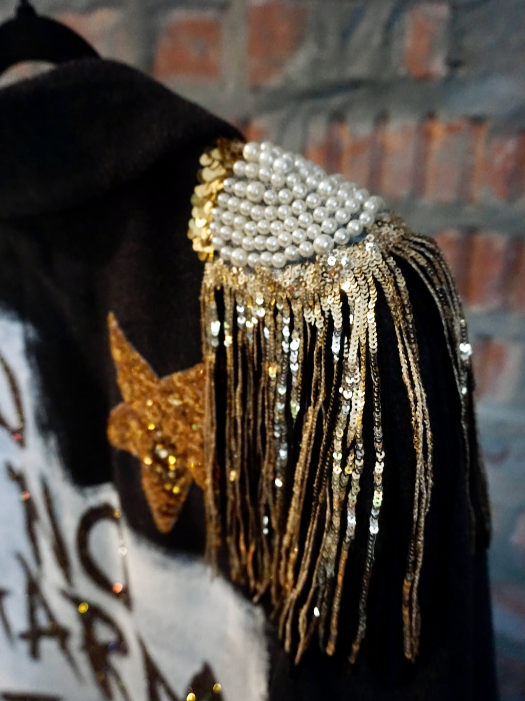 The stars, shoulder embellishments and tassels underline the cut and colour of the luxurious garment. Painted letters on back side of the garment got an eco friendly glitter finish. You make a statement wearing it, regardless of your outfit underneath. It's a must in every conscious and brave fashion closet.