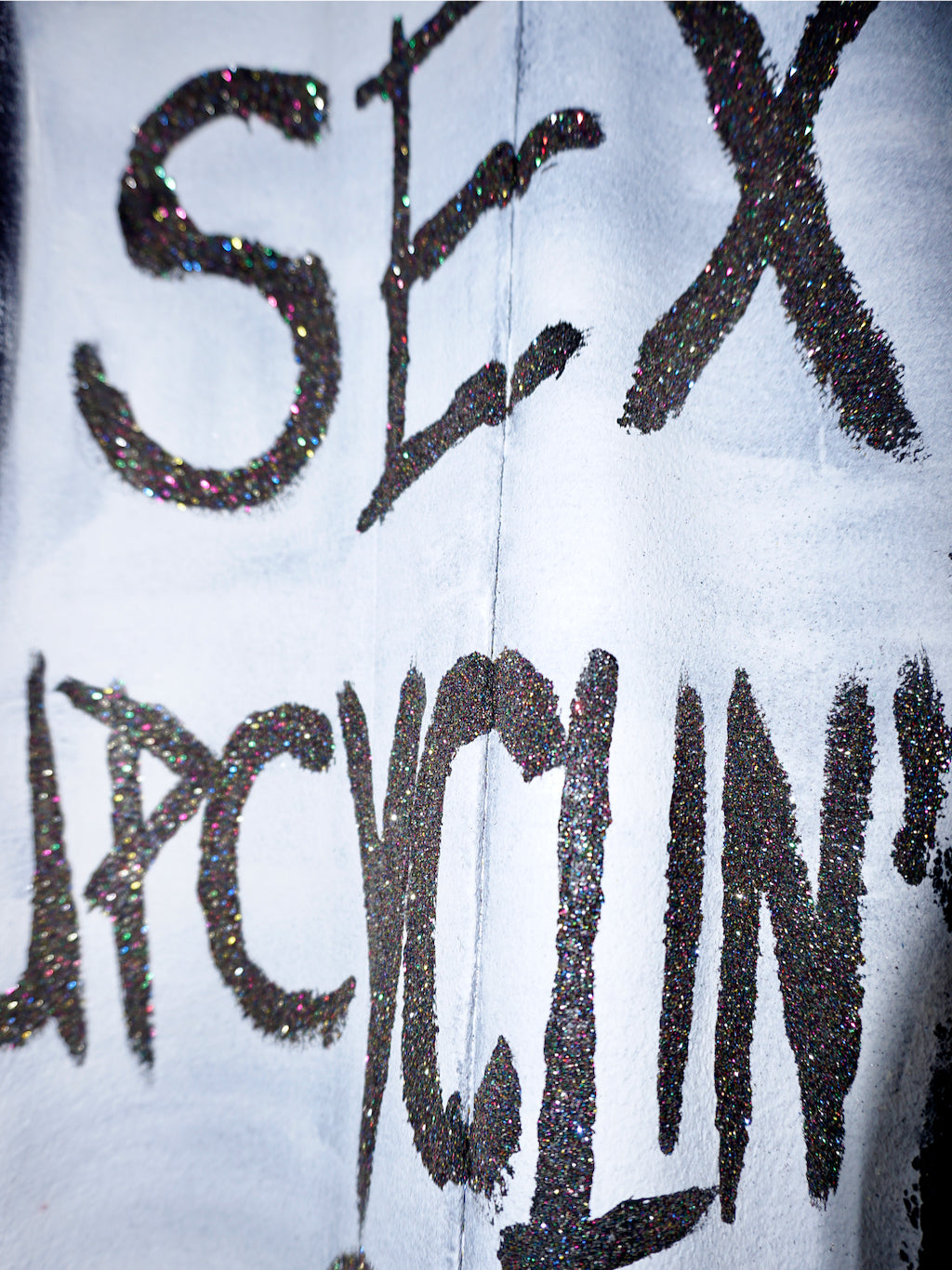The stars, shoulder embellishments and tassels underline the cut and colour of the luxurious garment. Painted letters on back side of the garment got an eco friendly glitter finish. You make a statement wearing it, regardless of your outfit underneath. It's a must in every conscious and brave fashion closet.